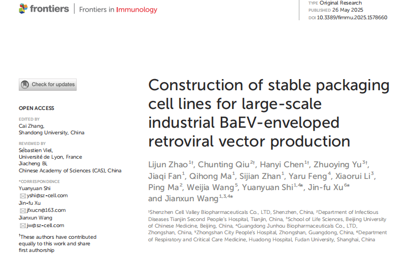 2025年5月26日,深圳evo真人视讯团队在《Frontiers in Immunology》(中科院2区,IF 5.7)杂志发表了题为“Construction of stable packaging cell lines for large-scale industrial BaEV-enveloped retroviral vector production”的研究报告。本文详细介绍了一种BaEV包膜逆转录病毒载体的稳定包装细胞系的构建,该细胞系所制备的逆转录病毒载体更适用于NK、T等原代细胞转导。现在,我司所构建的BaEV稳转包装细胞系于2024年7月17日保藏于广东省微生物菌种保藏中心,并已授权相关专利。