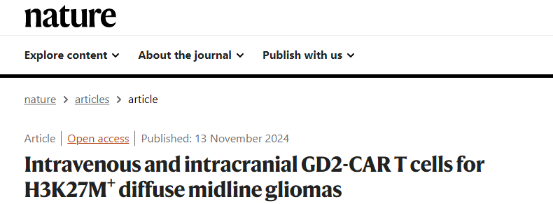 2024年11月,Nature期刊发表题为“Intravenous and intracranial GD2-CAR T cells for H3K27M+ diffuse midline gliomas”的临床研究。此研究显示静脉输注(IV)CAR-T并且后续侧脑室输注(ICV)CAR-T后,DIPG和脊髓弥漫性中线胶质瘤(sDMG)患者均出现肿瘤缩小,并在部分患者中产生了持续的抗肿瘤效果[1]。该GD2 CAR整合了来源于14g2a单克隆抗体的scFv、CD8跨膜结构域以及4-1BB和TCR zeta信号内结构域,并顺利获得逆转录病毒载体转导T细胞[2]。