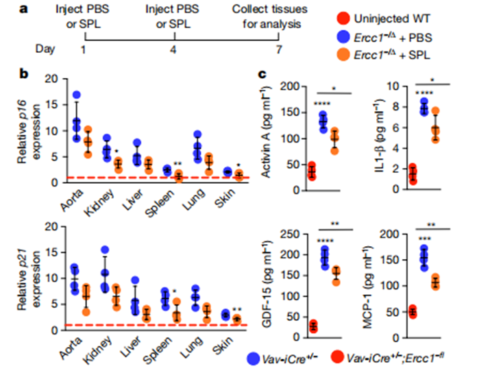 反之,将年轻健康小鼠的免疫细胞回输给衰老小鼠,一个月后检测,发现相关的衰老标志物水平显著减少,小鼠体内多处的组织和器官的衰老发生逆转。这证实了年轻的免疫细胞可一定程度逆转衰老小鼠的衰老。