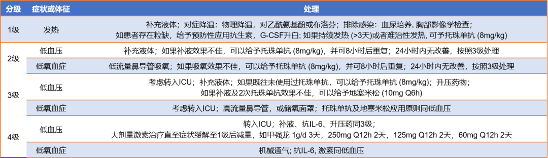 美国移植与细胞治疗学会(ASTCT)共识建议使用ARYOX-10筛选工具进行评估。同时将视盘水肿、颅内压、影像学诊断作为分级因素。参照Neelapu等提出的《CAR-T治疗相关毒性(10分)》评分系统及相关建议可以将 ICANS分为如图7所示的4个等级。
